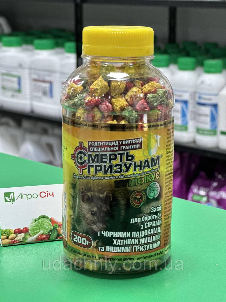 Препарат для знищення будь-яких видів щурів і мишей. Засіб має отруювальну дію навіть на так званих "стійких" до інших препаратів шкідників. Також суміш має муміфікувальний ефект, який так само позбавить вас неприємного Мертвого запаху. Ефективна дія препарату завдяки різним смаковим і ароматичним добавкам. Шкідники гинуть уже на 2-3 дні після поїдання приманки внаслідок задухи.
